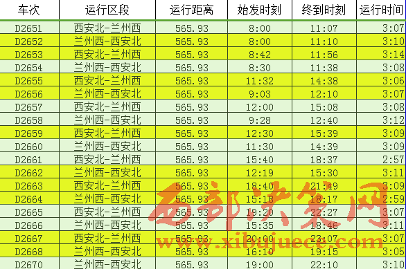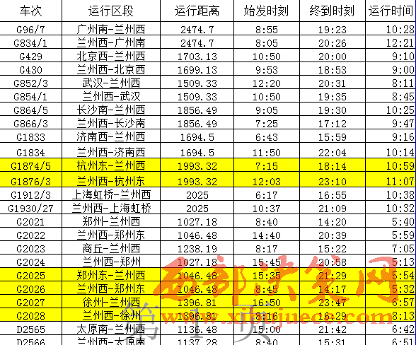從寶蘭高鐵列車開行方案來(lái)看,蘭州西至北京西開行動(dòng)車組列車1對(duì),為列車雙向?qū)﹂_,共計(jì)運(yùn)行1699公里,9:53從蘭州西站始發(fā),18:53達(dá)到北京西站,車次為 G430次,運(yùn)行時(shí)間9小時(shí)整;10:50從北京西站始發(fā),20:00到達(dá)蘭州西站,車次為 G429次。蘭州西至廣州南開行動(dòng)車組列車1對(duì),為列車雙向?qū)﹂_,共計(jì)運(yùn)行2474.7公里,8:05從蘭州西站始發(fā),20:26到達(dá)廣州南站,車次為 G834/1次;8:55從廣州南站始發(fā),19:23到達(dá)蘭州西站,車次為 G96/7次,運(yùn)行時(shí)間10小時(shí)28分。蘭州西至上海虹橋站開行動(dòng)車組列車1對(duì),為列車雙向?qū)﹂_,共計(jì)運(yùn)行2025公里,10:37從蘭州西站始發(fā),21:09到達(dá)上海虹橋站,車次為 G1930/27次,運(yùn)行時(shí)間10小時(shí)32分;6:17從上海虹橋站始發(fā),16:55到達(dá)蘭州西站,車次為 G1912/3次。