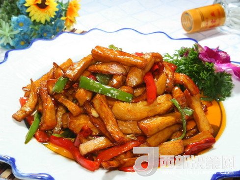 1. 將土豆削皮,切細(xì)絲,泡在水中洗去淀粉,既能避免其變黑,又能使其在炒燒時(shí)保持白嫩、爽脆。炒前撈出,瀝干水分。