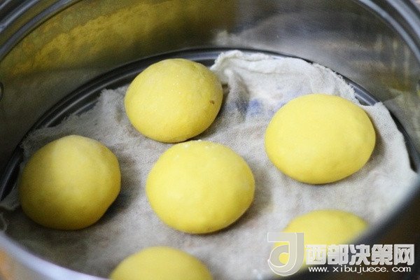 7、重復上述步驟做剩余的蜜豆包,全部做完后放蒸鍋中放置10—15分鐘左右,煤氣灶開火燒水,待水燒開后將蜜豆包放上去蒸15分鐘左右關(guān)火。