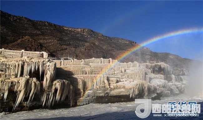 這是12月17日在山西吉縣黃河壺口瀑布拍攝的冰瀑彩虹景觀。當(dāng)日,黃河壺口瀑布出現(xiàn)彩虹景觀。壺口瀑布兩岸姿態(tài)萬千的冰瀑,與瀑布上空的彩虹相映成趣,美不勝收。(呂桂明 攝)