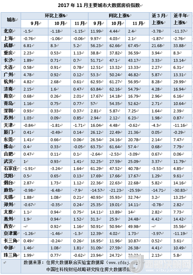2017年11月大數(shù)據(jù)房價(jià)指數(shù)監(jiān)測發(fā)現(xiàn),一線城市房價(jià)全面停漲,其中北京、上海繼續(xù)下跌,環(huán)京板塊累計(jì)跌幅較大;二線城市中除了成都、南京等少數(shù)城市外房價(jià)均相對(duì)穩(wěn)定;熱點(diǎn)三四線城市如佛山、東莞、合肥、無錫等也趨于停漲。