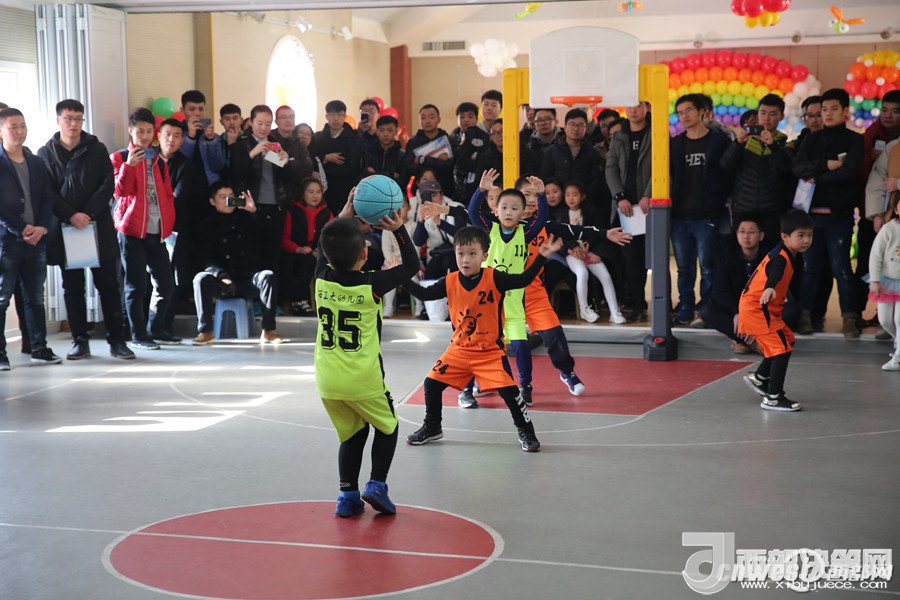 西北工業(yè)大學幼兒園教師董樂帶領(lǐng)小朋友展示籃球教學活動。