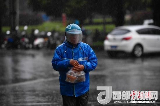 資料圖:外賣小哥冒雨送餐。中新社記者 劉冉陽 攝