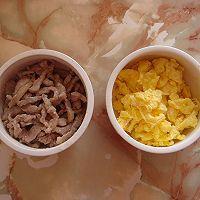 3. 雞蛋炒成塊兒。五花肉切絲,加少許干淀粉和蛋液滑炒制熟。豆角、香菇切絲備用。