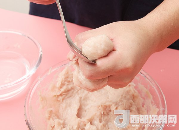 5、裝著魚(yú)丸的勺子在冷水鍋里輕輕抖一下,魚(yú)丸就自行脫落了。