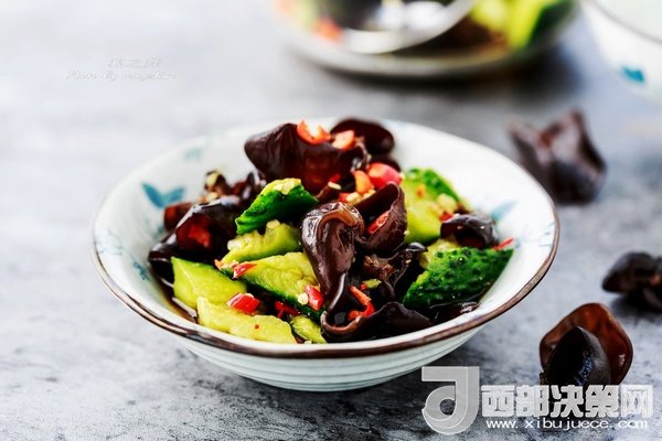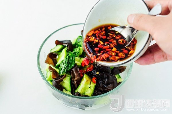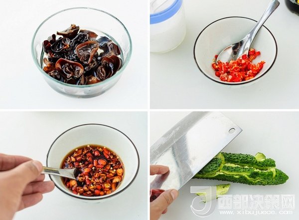 食材:黑木耳適量、精鹽1/4茶匙、黃瓜1根、白糖1/2茶匙、陳醋1茶匙、生抽1.5茶匙、紅辣椒適量。