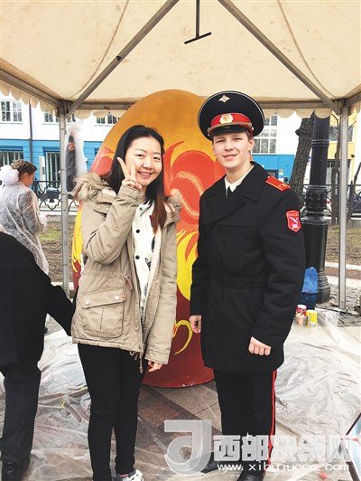 在俄羅斯的節(jié)日慶典活動中,姜若晨(左一)與當地軍校學生的合影。