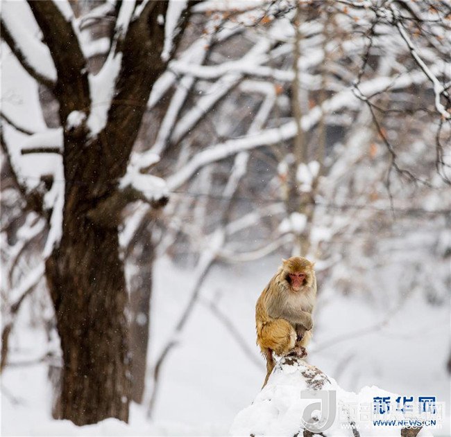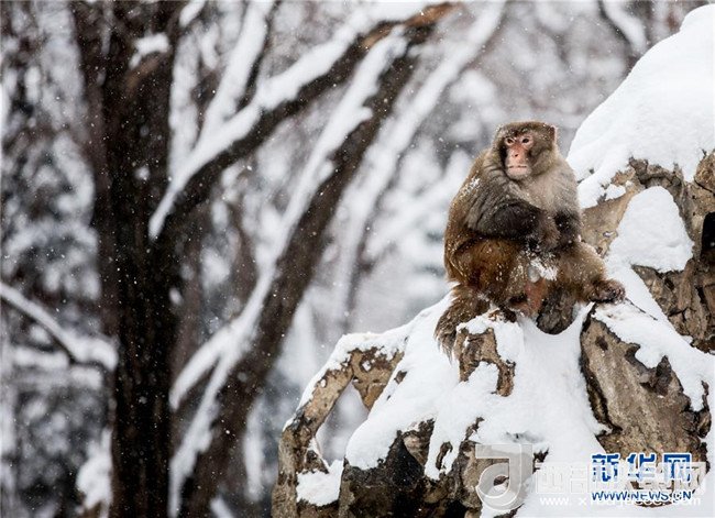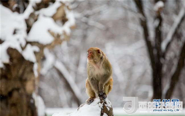 1月4日,安徽省淮北市相山公園的猴子獨立雪中。 當日,淮北迎來一場強降雪。(王文 攝)