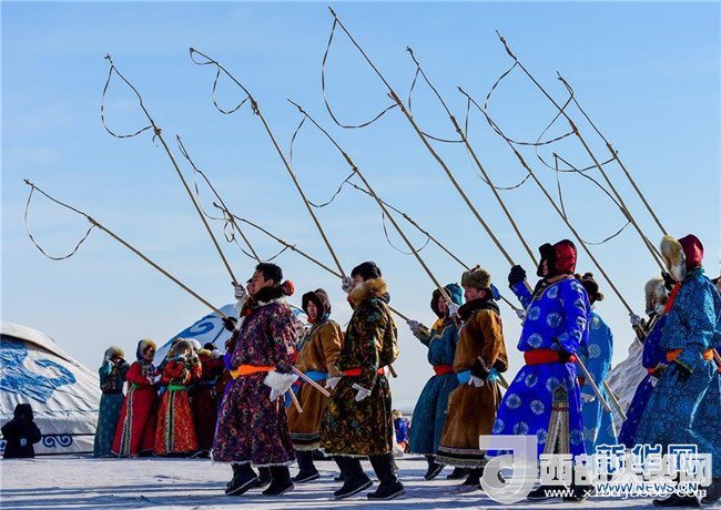 1月16日,在內蒙古錫林浩特鳳凰馬場,當?shù)啬撩裨诒硌萏遵R。