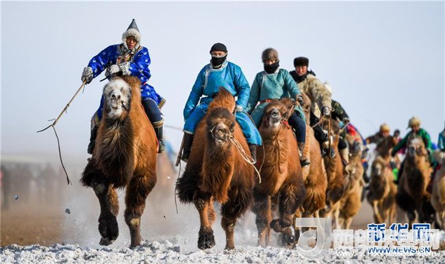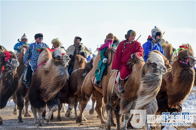 1月16日,在內蒙古錫林浩特鳳凰馬場,當?shù)貫跆m牧騎的演員們騎著駱駝進入會場演出。