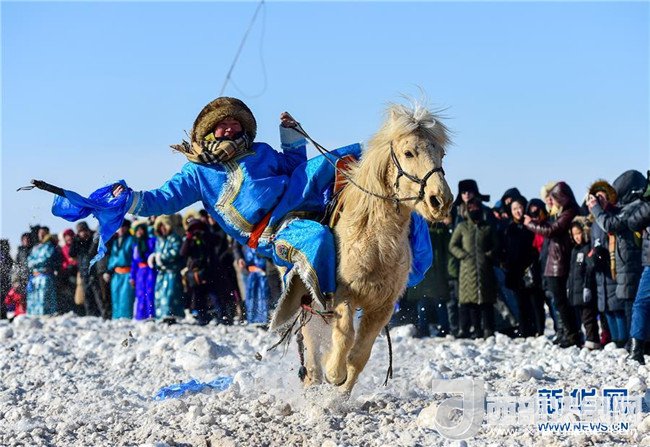 當日,“馬背上的歌聲”錫林浩特市冬季那達慕在錫林浩特市鳳凰馬場開幕。當?shù)啬撩裆碇?jié)日服裝,趕著自家的馬匹,參加速度賽馬、套馬、馬上拾哈達等多項比賽和娛樂活動。作為當?shù)囟韭糜沃匾椖?,本次那達慕吸引來自全國各地的游客和攝影愛好者前來觀看。新華社記者 連振 攝