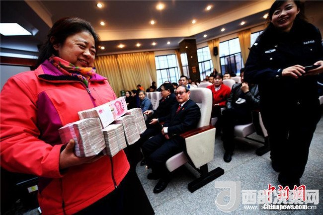 1月23日,發(fā)放現(xiàn)場(chǎng)滿臉笑容的市民抱著領(lǐng)到的現(xiàn)金。當(dāng)日,在2018年春節(jié)臨近之際,昆明市五華法院“法威行動(dòng)”執(zhí)行案款暨司法救助金集中發(fā)放在五華法院進(jìn)行。共對(duì)107件涉民生、涉金融案件發(fā)放執(zhí)行案款約5000萬(wàn)元,同時(shí)對(duì)13起執(zhí)行案件中的14名特困人員發(fā)放司法救助金346000元。此次集中發(fā)放案款暨司法救助金大會(huì),旨在彰顯司法的權(quán)威和司法的人文關(guān)懷,確保申請(qǐng)執(zhí)行人和特困人員的合法權(quán)益得到及時(shí)兌現(xiàn),讓民眾過上一個(gè)歡樂祥和的新春佳節(jié)。記者李進(jìn)紅攝