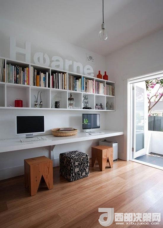 橫向延伸的書架與桌板,打造出了可供雙人使用的工作臺,線條簡潔流暢,也能讓兩個人毫無障礙地溝通交流。