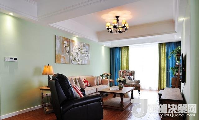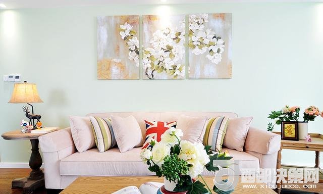 沙發(fā)墻上的油畫和茶桌刪搞得插花,遙相呼應,給人清新自然之感。