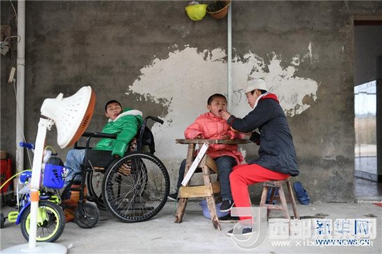 饒梅香代養(yǎng)的三個(gè)孩子在屋外曬太陽(yáng)(2月14日攝)。