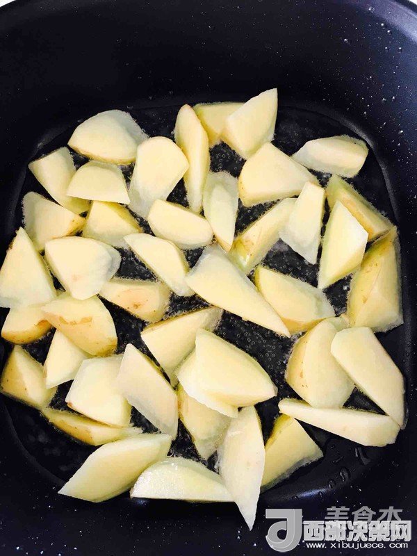 2.開小火,鍋中倒入偏多一些的油,油熱下入土豆,小火慢煎。(油能莫過(guò)土豆底層就行)