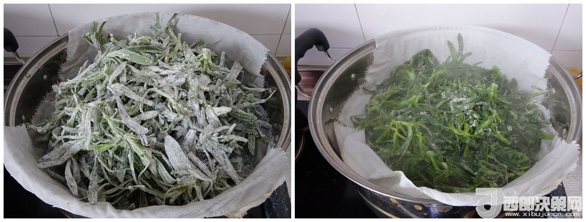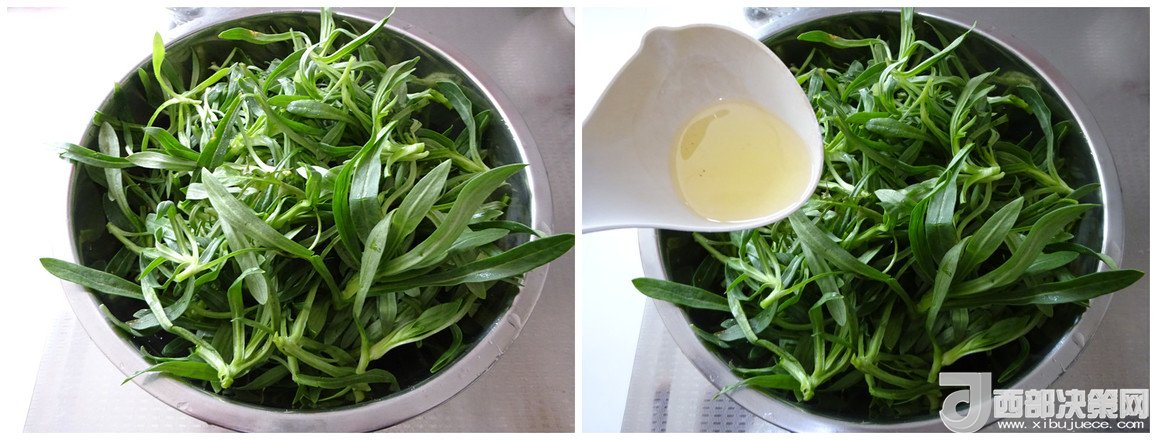 1.面條菜洗凈、控至不滴水,放入大盆中,淋入少許植物油抓勻,這樣可以防止粘連