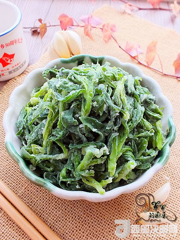 2.放入玉米淀粉和面粉,二者比例1:1,抓勻,使每片菜葉都裹上一層薄薄的粉,不用質(zhì)疑我為什么用一半的玉米淀粉,這樣做,蒸出來的菜口感好、顏色漂亮,不信您試試