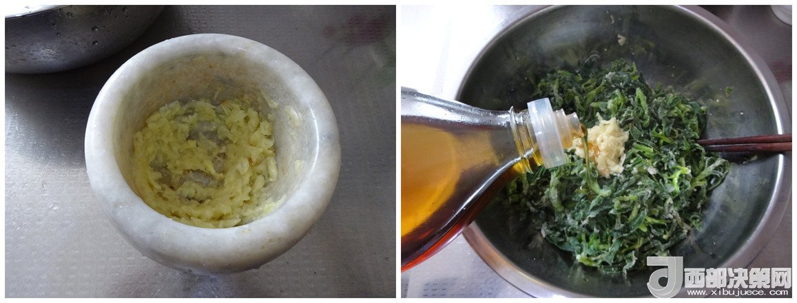 5.大蒜放一丟丟鹽搗成蒜泥,放入盆中,倒入適量的香油,拌勻即可,每到這個時候我就會開始流口水了,香油和蒜泥混合后的香氣,太誘人了 記住,吃蒸菜必須放蒜泥,不然味道減一半哦