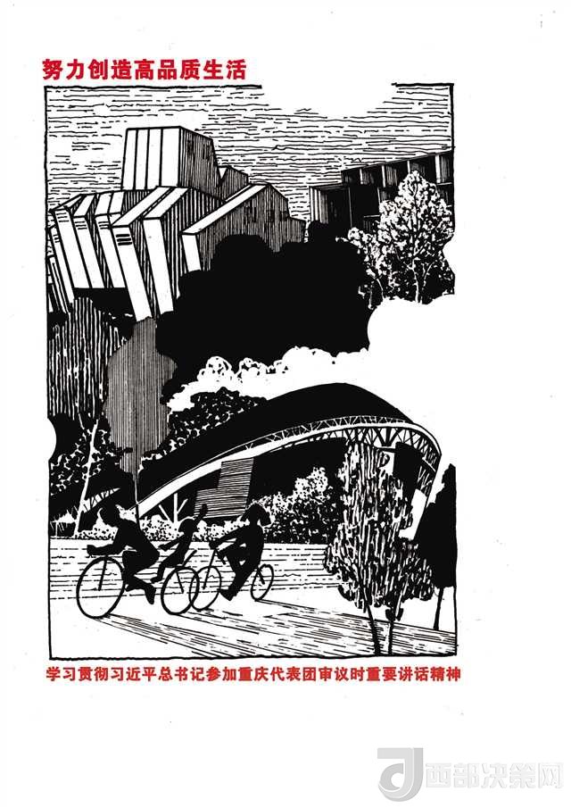 另一組負(fù)責(zé)“創(chuàng)造高品質(zhì)生活”的師生也遭遇類似的問題。最初師生們想用一組市民在公園鍛煉的場景來闡述這個(gè)主題,但很快就發(fā)現(xiàn)這樣的畫面太簡單蒼白。最終,他們將重慶大劇院、重慶美術(shù)館、奧體中心等重慶的標(biāo)志性建筑作為文化符號列入畫稿中,才有了令人耳目一新的感覺。