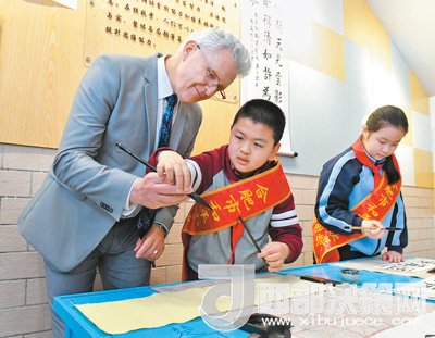 日前,加拿大溫哥華公立教育局考察團走進安徽省合肥市和平小學參加中外文化交流活動,親身體驗書法、民樂和戲曲等傳統(tǒng)文化課程,零距離感受中國文化的魅力。圖為加拿大客人和和平小學的學生們一起學習書法。