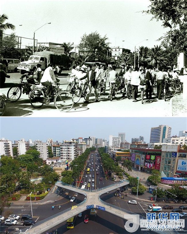 拼版照片為??谑袨I海大道今昔對比(上圖為1990年1月10日新華社記者姜恩宇攝,下圖為2018年4月15日新華社記者趙穎全攝)。