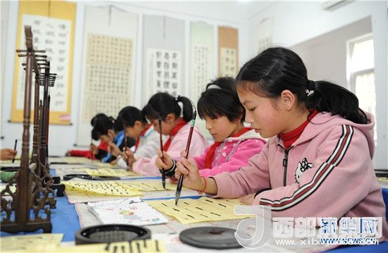 4月25日,陜西省勉縣溫泉鎮(zhèn)中心小學(xué)學(xué)生在進(jìn)行書(shū)法課練習(xí)。