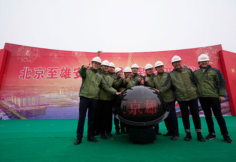 河北雄安新區(qū)首個重大交通項(xiàng)目北京至雄安城際鐵路(簡稱“京雄城際鐵路”)正式開工建設(shè),這是建設(shè)者在開工儀式現(xiàn)場合影留念(2月28日攝)。新華社記者 邢廣利 攝
