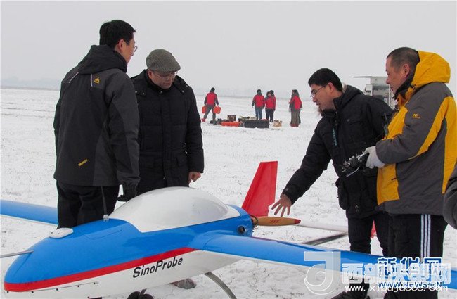 黃大年(左二)及團(tuán)隊(duì)成員在極寒天氣下進(jìn)行固定翼無人機(jī)試飛(2013年1月20日攝)。