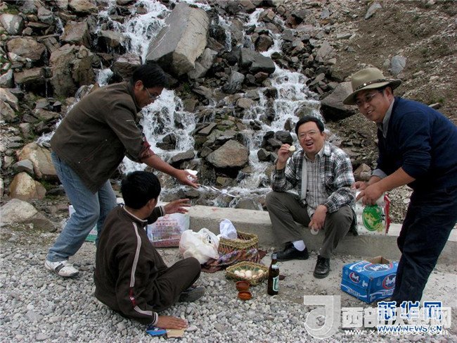 鐘揚(yáng)(右二)與西藏大學(xué)師生在西藏采集種子時(shí)在戶外吃午飯(2007年8月21日攝)。