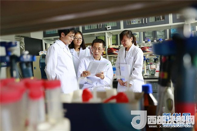 施一公(右二)與團(tuán)隊(duì)成員討論文章細(xì)節(jié)(資料照片)。