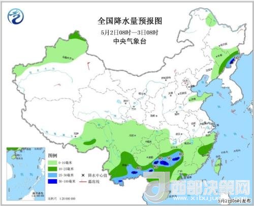 5月2日08時至3日08時,吉林東部、湖南南部、貴州南部、廣西大部、云南南部等地的部分地區(qū)有中到大雨,其中,吉林東部、湖南南部、貴州東南部、廣西北部和西部、云南南部等地局地有暴雨(50~90毫米);上述局部地區(qū)將伴有短時強(qiáng)降水等強(qiáng)對流天氣。新疆北部和南疆盆地東部、內(nèi)蒙古中西部、遼東半島等地有4~6級風(fēng);新疆南疆盆地等地的部分地區(qū)有揚沙或浮塵天氣(見圖1)。