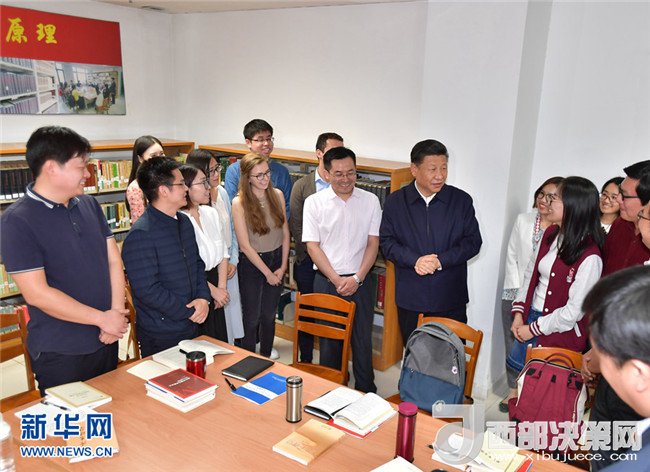 隨后,習(xí)近平走進國際馬克思主義文獻中心,察看館藏馬克思主義典籍,詢問“馬藏工程”進展情況,稱贊他們的工作非常有意義。閱覽室里,一些中外學(xué)生正在就“解讀新時代”進行座談交流。習(xí)近平走到他們中間,認真傾聽討論,并同大家互動交流??倳泦柎蠹覟槭裁催x擇馬克思主義專業(yè)、學(xué)習(xí)這個專業(yè)有什么體會,同學(xué)們興奮地一一回答。同學(xué)們問總書記“您是一個堅定的馬克思主義者,您學(xué)習(xí)馬克思主義有什么好的方法”,總書記熱情同大家分享了自己的學(xué)習(xí)經(jīng)驗。他對在場的外國留學(xué)生說,要了解中國,就要了解中國的歷史、文化、人文思想和發(fā)展階段,特別是要了解當(dāng)代中國的馬克思主義。習(xí)近平強調(diào),北京大學(xué)是中國最早傳播和研究馬克思主義的地方,為馬克思主義在中國的傳播和中國共產(chǎn)黨的成立作出了重要貢獻。今年是馬克思誕辰200周年,也是《共產(chǎn)黨宣言》誕生170周年。我們對馬克思和《共產(chǎn)黨宣言》的最好紀念,就是把黨的十九大精神和新時代中國特色社會主義思想這一當(dāng)代中國馬克思主義研究好、宣傳好、貫徹好。他勉勵大家緊密聯(lián)系世情國情黨情的變化,認真開展新時代中國特色社會主義思想研究,拿出更多有分量有說服力的研究成果。