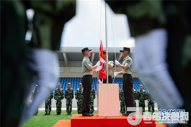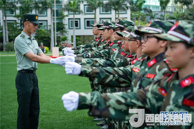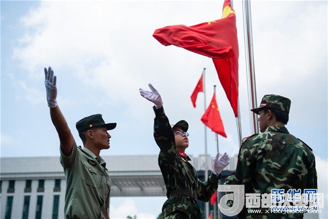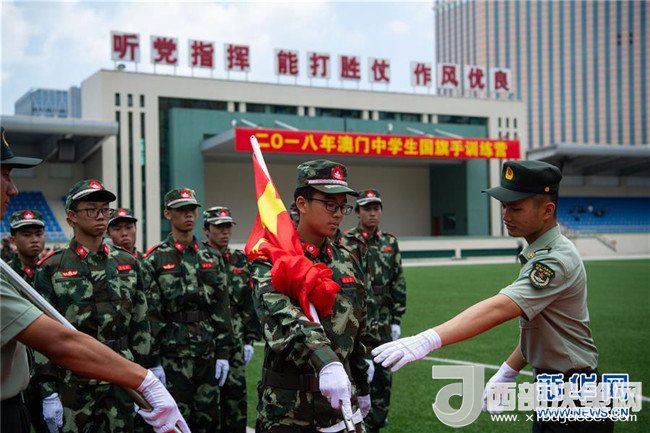 當日,“國旗下的說話·2018年澳門中學生國旗手訓練營”舉行。來自30所澳門中學的300余名中學生會聚解放軍駐澳門部隊氹仔軍營,在迷彩的青春方陣中親手升起鮮艷的五星紅旗。新華社記者張金加攝