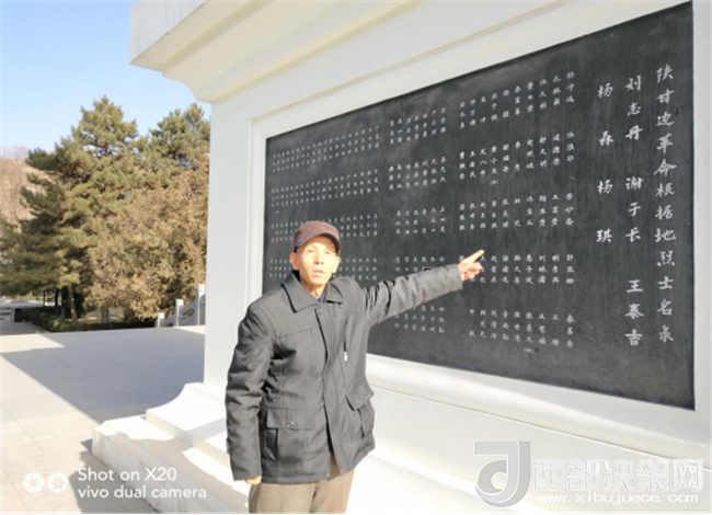 老人說一開館他就進館參觀過了,害怕打擾工作,一直等到了午后才打的電話。他引我到紀(jì)念碑前,指著他伯父的英名高興地說,“多少年了,到哪里都找不到,陜北、西安、陜南、寧夏的好些地方都跑遍了,可始終不可得。從退休到現(xiàn)在,已經(jīng)找了快20年了,本來都要放棄了,一個慶陽黨史系統(tǒng)的工作人員給了他希望,讓他到南梁來看看。果不其然?。?rdquo;暖陽高照,紀(jì)念碑下,先輩事跡,一位老人緩緩道述。因為這些年他的大部分時間和精力都花在了這件事上,所以碑刻的很多先輩英名他都知道,他們的革命故事大都知之甚詳。其間,越聽我越汗顏、越覺得心虛甚至慚愧。每每講到激動處、高興處,老人都情難自已的流下了淚,也不時地吸引著往來游客駐足靜立、聆聽前事、接受教育。