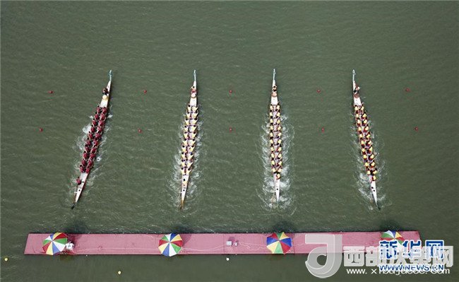 5月26日,參賽龍舟在浙江省溫州市會(huì)昌湖水面上比拼。當(dāng)日,浙江溫州第五屆龍舟聯(lián)賽的一場(chǎng)比賽在會(huì)昌湖水上公園龍舟基地舉行。眾多龍舟同場(chǎng)競(jìng)技,上演了精彩的水上比拼。新華社發(fā)(蘇巧將攝)