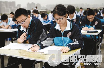 27日,來自西安各區(qū)縣的中學(xué)生在西安大明宮含元殿遺址進行筆試答題。