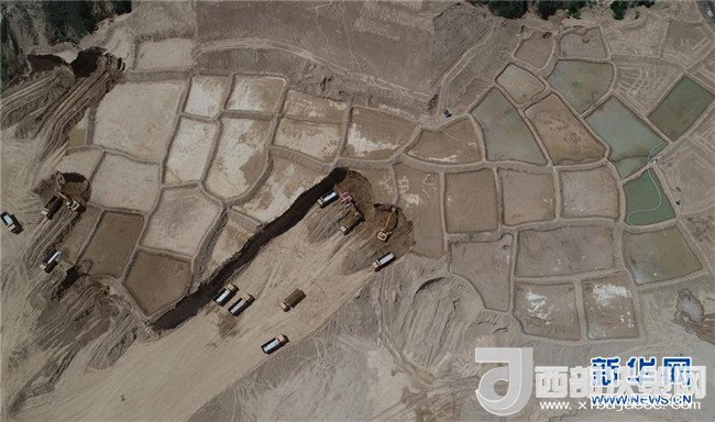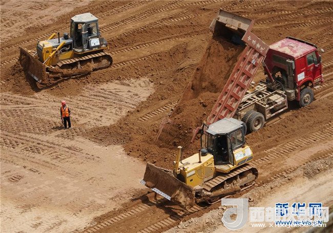 5月30日,工程車(chē)輛在延安黃河引水工程南河水庫(kù)施工現(xiàn)場(chǎng)進(jìn)行壩體填筑。