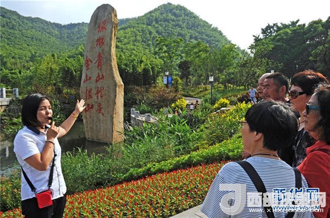 6月3日,安吉縣余村農家女導游潘春連(左一)向游客介紹當?shù)?ldquo;美麗鄉(xiāng)村”景色。新華社記者 譚進 攝