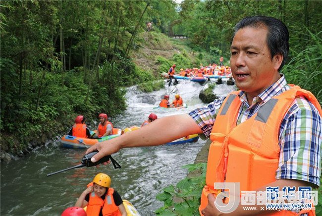 6月2日,安吉縣余村荷花山漂流景區(qū)創(chuàng)辦人胡加興(前)在巡查河道漂流安全狀況。新華社記者 譚進 攝