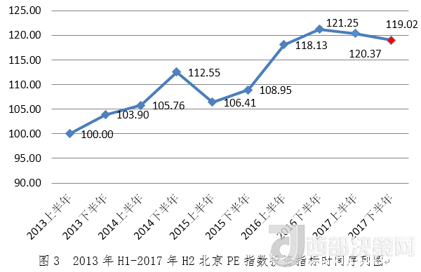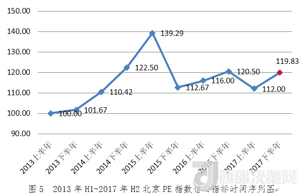 2017年下半年北京PE指數(shù)為120.25,環(huán)比增長1.18%,同比下降3.03%。從指數(shù)走勢(shì)看,2017年下半年北京PE指數(shù)較上半年穩(wěn)步回升,仍處于高位。
