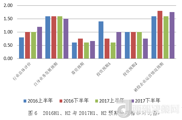 相較于募資、投資、退出指標(biāo)的微降,機(jī)構(gòu)信心指標(biāo)上漲顯示投資人對(duì)2018年北京地區(qū)股權(quán)投資發(fā)展充滿了信心。從預(yù)期分項(xiàng)指標(biāo)看,雖然指標(biāo)所處水平顯示投資人認(rèn)為2018年上半年行業(yè)總體仍將保持平穩(wěn)發(fā)展態(tài)勢(shì),對(duì)自身業(yè)務(wù)發(fā)展預(yù)期、募資預(yù)期、投資預(yù)期保持中性,但是行業(yè)總體評(píng)價(jià)、被投企業(yè)運(yùn)營情況預(yù)期、募資預(yù)期、投資預(yù)期這四個(gè)指標(biāo)均較上期有所增長,而自身業(yè)務(wù)發(fā)展預(yù)期指標(biāo)和投資預(yù)期指標(biāo)較上期有所下降,綜合顯示投資人對(duì)行業(yè)和自身業(yè)務(wù)發(fā)展謹(jǐn)慎樂觀的態(tài)度。