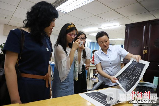 兩位同學(xué)在正在體驗碑文的傳拓技藝。中新社發(fā)瞿宏倫攝