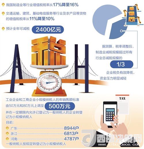 從5月1日起,我國制造業(yè)等行業(yè)增值稅稅率從17%降至16%,交通運輸、建筑、基礎(chǔ)電信服務等行業(yè)及農(nóng)產(chǎn)品等貨物的增值稅稅率從11%降至10%,預計全年可減稅2400億元。