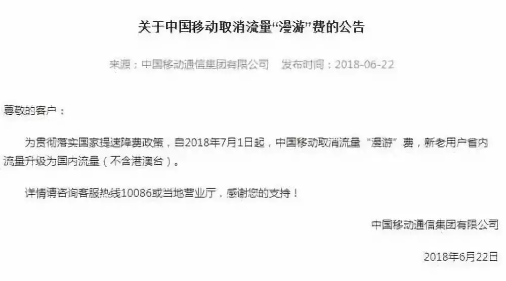 6月22日,中國(guó)移動(dòng)、中國(guó)聯(lián)通和中國(guó)電信先后宣布自7月1日起取消流量“漫游”費(fèi),手機(jī)用戶(hù)省內(nèi)流量升級(jí)為國(guó)內(nèi)流量(不含港澳臺(tái))。