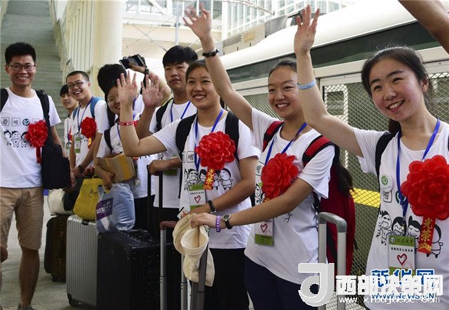 7月10日,前往寧夏西吉支教的志愿者與前來送行的師生揮手告別。
