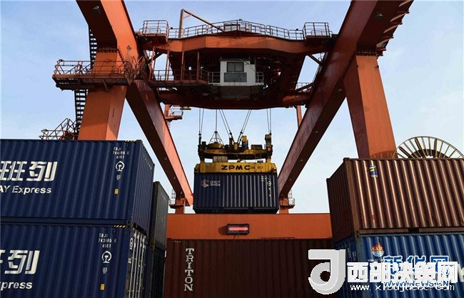 在青島膠州灣國際物流園,龍門塔吊在往中亞(青島)國際班列上裝載貨物(5月7日攝)。