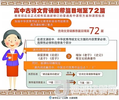 其中,語(yǔ)文課標(biāo)最突出,中華優(yōu)秀傳統(tǒng)文化方面的內(nèi)容貫穿必修、選擇性必修和選修各個(gè)部分。一是內(nèi)容更全,在“課內(nèi)外讀物建議”部分,除保留原有《論語(yǔ)》《孟子》《莊子》外,增加了《老子》《史記》等文化經(jīng)典著作,要求學(xué)生廣泛閱讀各類(lèi)古詩(shī)文,覆蓋先秦到清末各個(gè)時(shí)期。二是分量更多,課程標(biāo)準(zhǔn)明確規(guī)定“課內(nèi)閱讀篇目中,中國(guó)古代優(yōu)秀作品應(yīng)占1/2”。三是要求更高,在全面加強(qiáng)的同時(shí),還設(shè)置中華優(yōu)秀傳統(tǒng)文化學(xué)習(xí)專(zhuān)題,進(jìn)行中華傳統(tǒng)文化經(jīng)典作品深入學(xué)習(xí)研討。將原標(biāo)準(zhǔn)“誦讀篇目的建議”改為“古詩(shī)文背誦推薦篇目”,推薦篇目數(shù)量也從14篇(首)增加到72篇(首),提高了學(xué)習(xí)要求。