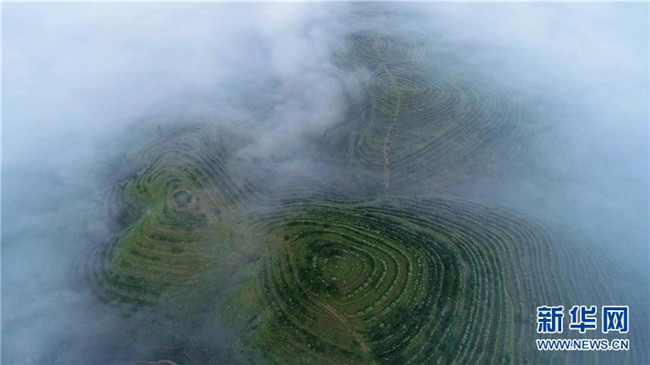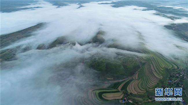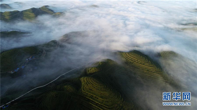 云霧繚繞的寧夏彭陽縣金雞坪梯田公園(7月17日無人機(jī)拍攝)。新華社記者王鵬攝