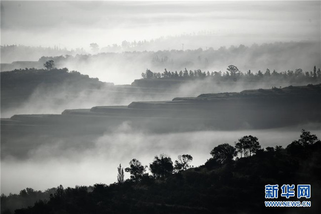 云霧繚繞的寧夏彭陽縣金雞坪梯田公園(7月17日攝)。